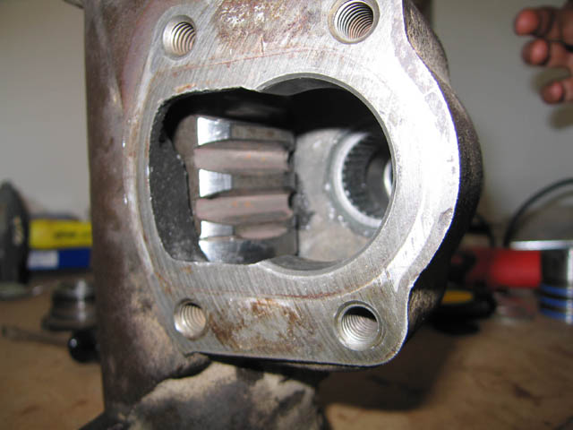 As you can see, within the housing, the upper support bearing is installed so that it is just below being flush with the housing at that point. The gear teeth you see on the left within the housing is the piston.You will need to reassembe the input-shaft portion before installing the sector shaft so that you can turn the piston and install the loose bal bearings. The sector shaft has not been shown on this page, because frankly I forgot to take a picture of it. There are 3 shafts for this box. One that connects to your steering wheel shaft, one that looks like a screw, and one that connects to the pitman arm at the bottom ( closest to the ground when installed into the vehicle) of the power steering box. This third shaft (which is also the largest) is the sector shaft.