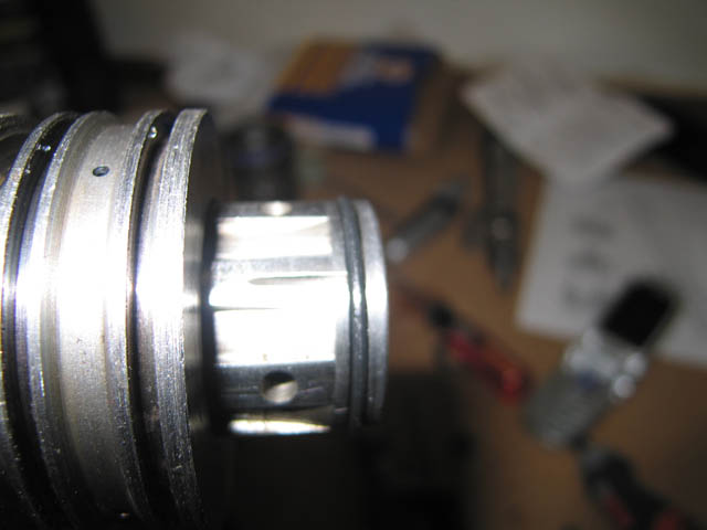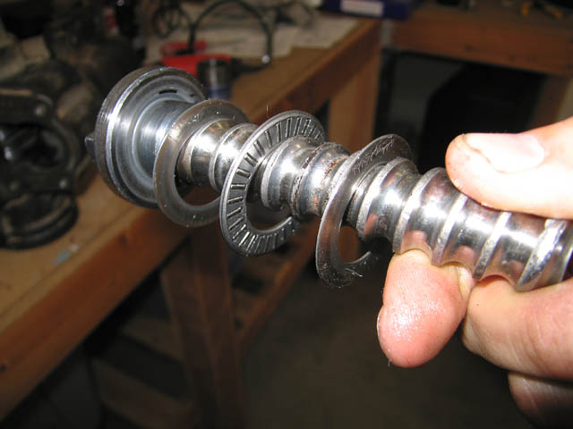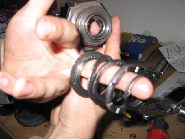 This is the order of shim-bearing-shim for this screw-shaft. This is installed into the housing before the piston is installed. As you can see on the right-most side of the shaft, you can see a white spot where the shaft is damaged. If you aren't careful reinstalling the loose ball-bearings, one will get free and do more damage than is shown. I was lucky for it to do such little damage. Liberally (not fill) use petroleum jelly on the threads of the screw. This will help you install the loose ball bearings.