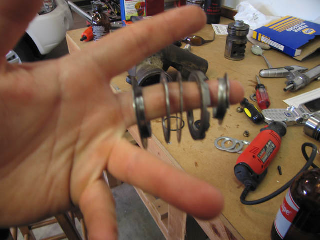 Since my box was already in pieces and the diagram from the Napa rebuild kit was garbage, I had to figure out the order on my own. The pieces in this kit are all relatively different if you pay close enough attention. Shown here is the order in which you reassemble the parts onto the cap for the input (facing the driver) side. In the background, you can see the piston, next to the Napa parts box.