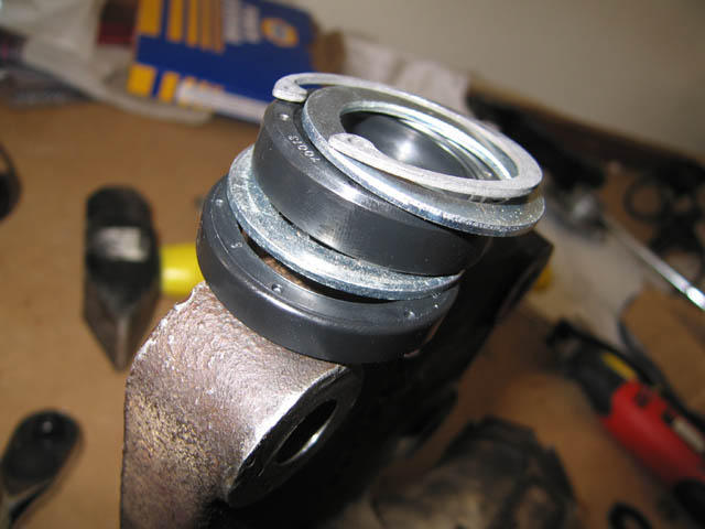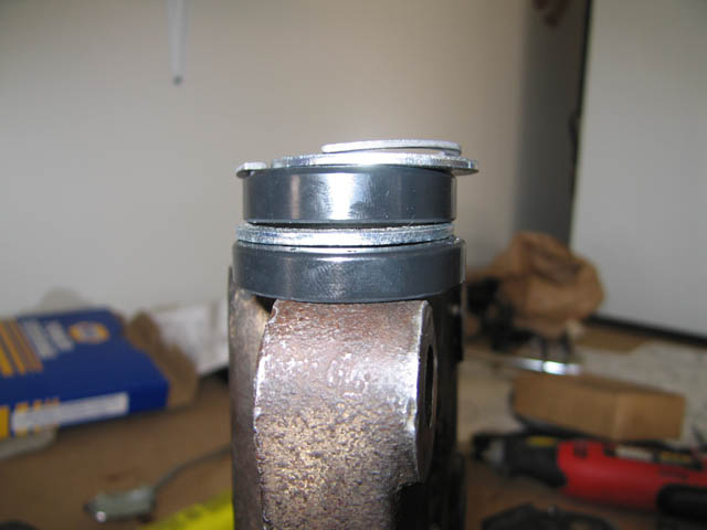 Before you install your sector shaft into the housing, I would recommend installing the lower shaft seals so that you do not have to worry about damaging the shaft. I found that there was a lot of room for the seals, and quite a bit of space between the retaining ring and the installed seals. I discovered that this is ok and the seals will have some wiggle room if they want. With the bottom of the box pointing towards the sky (the small, circular end that is) Install the seals in the order shown. First to go in is the thinner seal, then a shim, then the fatter seal, then another shim and finally the snap ring.