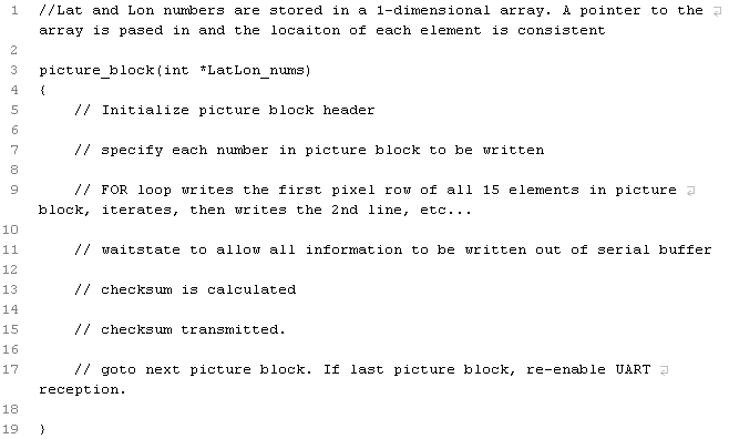 So following that method, built a driver that handles all ‘graphics’ in terms of blocks. Unfortunately, I had to figure out each display character in my intended set. Naturally I had to have 0 through 9 and a radix point to be able to display the Lat/Lon output messages. Also I had to develop each letter to be displayed as well, so naturally the alphabet is somewhat limited to “L” “A” “T” “O” “N” ;-). I arranged each block in a 3-dimensional array. Therefore, when each line of the screen was to be drawn, it is possible to just call the firsts element of the array for the specific letter/number, and then let the graphic construction algorithm do the rest of the work for me.