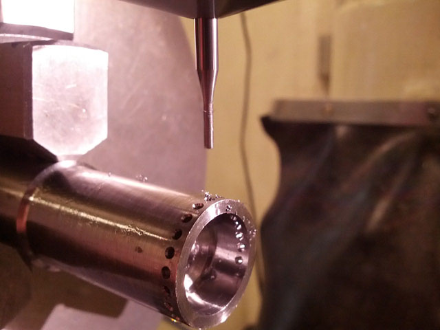 The 23 stone mounts were drilled on a mill using an index table in a 3 stage process. Stage one is to use a 0.8mm spotting drill to pilot the holes.